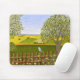Un tapis de souris avec une belle image d'une scène naturelle : Un oiseau assis sur une clôture patinée, des fleurs sauvages poussant autour de la clôture, un fermier sur un tracteur, travaillant sa terre, des arbres avec des feuilles, et des terres agricoles de différentes couleurs. Oeuvre originale de W.B.