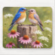 Two vibrant bluebirds perch atop a wooden fence post, surrounded by blooming pink cone flowers and white Queen Anne's Lace flowers in a summer meadow