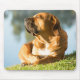 Tapis de souris avec une image haute définition d'un beau chien Boerboel allongé sur l'herbe, devant la rivière, tout en profitant du soleil tôt le matin avec les yeux fermés. Personnalisable