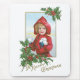 Carte Vintage de Noël illustration d'une fille dans un capot rouge avec des boules de neige.
