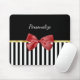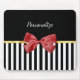 Une élégante mousepad aux rayures verticales en noir et blanc, agrémentée d'une bande élégante en or FAUX et d'une image d'un arc de style ruban rouge. Personnalisez-le en ajoutant le nom de cette fille spéciale dans votre vie. Image imprimée plate, NON métallique ou arc réel.