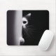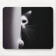 Un curieux chat blanc regarde de derrière un mur avec ses whiskies et sa patte contre un arrière - plan sombre
