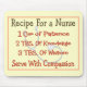 Soignez les cadeaux "recette pour une infirmière", des T-shirts, tasses, porte - clés, casquettes, sacs fourre-tout, cartes, timbres-poste, boutons, magnet… grand pour n'importe quelle nouvelle infirmière de diplômé….