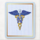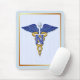Cette canette de soins infirmiers présente des serpents dorés jumelés autour d'un personnel bleu clair avec des ailes bleues plus profonds et une grande lettre N.