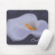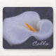 Cette mousepade présente un calla illustré (Zantedeschia aethiopica) dans un violet gris muet avec un centre orange et jaune. Il y a une zone de texte personnalisable dans le coin inférieur droit en script cursif simple.