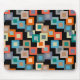 Ce pavé de souris a un design géométrique de carrés à l'intérieur des carrés dans des tons plus clairs de bleu, turquoise, orange, bronzé, blanc cassé, mangue et gris sur un champ de noir.