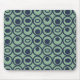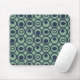 Ce pavé de souris a un design géométrique de cercles en rangs avec des cercles ou ovales à l'intérieur en bleu sur un champ de vert.