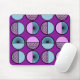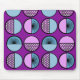 Ce tapis de souris a un design moderne du milieu du siècle de demi-cercles, certains avec des éclats, certains avec de petits cercles, et d'autres juste solide, en bleu et violet.
