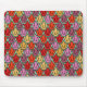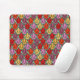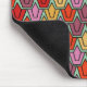 Ce pavé de souris a un design art déco de tulipes de pentagones et trapézoïdes en orange, rouge, violet, or et vert.