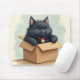 Un chat noir moelleux avec un collier rouge et une cloche dorée est confortablement niché dans une boîte ouverte en carton