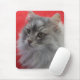 Mousepad avec l'image du chat sibérien aux cheveux longs tigré argenté avec l'arrière - plan rouge.