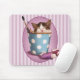 Chaton adorable faisant une sieste dans un pot bleu de crayon de point de polka, peint par l'artiste Maryline Cazenave.