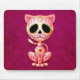 Cette conception rose adorable de chaton est décorée des remous et des motifs de point. Fleurissez le cercle de pédales les yeux au beurre noir purs dans la tradition du jour des crânes morts de sucre. Le chat s'assied, regardant en avant avec sa queue ondulant à l'arrière-plan. La tête surdimensionnée se repose sur un corps minuscule qui crée un espiègle, bande dessinée comme l'aspect. Une étoile de cinq points se repose au milieu du front du chaton tandis qu'un coeur rouge et jaune lumineux apparaît au centre du coffre. Une ombre tombe sur l'arrière - plan rose vibrant faisant la conception semblent flotter juste au-dessus de la surface de ce tapis de souris. Ce petit chat mignon est un amusement et une conception élégante inspirés par les beaux motifs du jour des crânes morts de sucre.