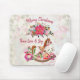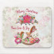 Une mousepad festive de noël. L'arrière - plan est un collage de style vintage avec une image défraîchie de roses roses, de feuilles verts et d'écriture française. Au-dessus se trouve un joli bouquet de noël poinsettia et un cheval victorien à bascule entouré de jolis pivoines roses. Le texte dit "Joyeux Noël" et "Paix, Amour & Joie".