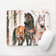 Un cheval noir et un cheval blanc debout dans une forêt d'automne rouge.