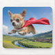 A mousepad featuring a superhero Chihuahua wearing a red cape flying over a pretty scene.