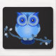 Le pavé de souris a un design monochromatique bleu d'un hibou sur une branche avec des feuilles.