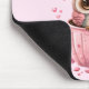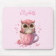 Mousepad avec l'adorable image d'un hibou assis dans une tasse à café. Des coeurs se balançant et un seul rose placé au fond de la tasse.