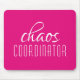 Coordinateur Chaos Pink Typographic Text Mouse Pad présente un design simple du texte "chaos coordinateur" dans un script blanc amusant sur un arrière - plan rose. Parfait pour cette maman occupée, enseignant, chef d'équipe sportive ou patron de travail. Conçu par ©Evco Studio www.zazzle.com/store/evcostudio