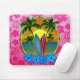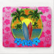 Beau coucher du soleil de plage derrière des planches de surf et des palmiers, encadrés avec des fleurs de bambou et de ketmie. Avec un arrière - plan rose des tortues de mer de Honu et des fleurs hawaïennes de ketmie.