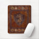 Image de couverture de livre en cuir médiévale avec un lion effréné dans la forme d'un bouclier.