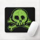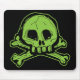 Un graphique scribbly vert et noir d'un crâne et des os croisés.