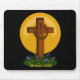 Cross with Crown of Thorns around it, religious mouse pad. Personalized name/date, bright yellow sun in background with purple and yellow flowers. Black, brown, yellow, and green. John 3:16 printed on cross.