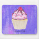 un MOUSEPAD avec l'illustration d'un cupcake délicieux. Le gel rose et les gouttelettes de chocolat. Porte-cupcake jaune et framboise sur le dessus. Yummy ! L'arrière - plan est une texture abstraite violette avec des petits coeurs partout.