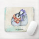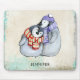 A personalized mouse pad with an adorable illustration of a penguin couple cuddling together. Wearing winter scarves and hats. Set on a cream colored vintage texture with turquoise accents along the edges.