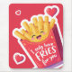 A cute and colorful cartoon illustration of a red French fries carton with a happy kawaii smiling face. The design features a floating red heart and the romantic funny pun quote "I only have FRIES for you". The image has a white sticker border, making it perfect for Valentine's Day greeting cards, fast food lovers, and humorous romantic gifts. Isolated design.