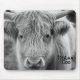 Un tapis de souris avec une image noire et blanche d'une des vaches des montagnes célèbres de l'Ecosse.