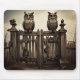 Ce sont des sculptures de hibou, finement sculptées, qui ornent un portail en bois rustique, créant une entrée captivante. Les caractéristiques détaillées des chouettes et le regard perçant ajoutent un élément de mystique et de charme à la scène