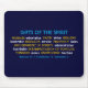 DONS Bleus Élégants et modernes DE L'ESPRIT inspirationnel Christian Mouse Pad, avec typographie jaune, blanc et cyan contre un riche arrière - plan bleu minuit. Les dons sont tirés des livres bibliques de Romains 12, 1 Corinthiens 12 et Ephésiens 4, et représentent les dons donnés par l'Esprit Saint aux croyants. Les cadeaux "majeurs" sont ceux qui sont dépeints par le coque supérieur jaune, et les cadeaux "mineurs" par le coque inférieur blanc. Le texte CYAN est PERSONNALISABLE, vous pouvez donc changer de titre en CADEAUX SPIRITUELS, et ajouter un nom à la place des références des Écritures. Cela ferait un cadeau élégant pour Noël, Anniversaires, Nouveaux Chrétiens, étudiants de la Bible, et pour toute occasion toute l'année.