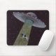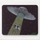 Un dessin au crayon couleur d'une vache malheureuse enlevée par des aliens dans une soucoupe volante, une nuit sombre et étoilée. Le troupeau effrayé s'agite dans l'arrière - plan.