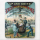 Vers 1885 - Publicité pour Ginger Ale avec ballon et panier avec gardiens noirs. Deux femmes boivent de l'Excelsior Ginger Ale, ce qui implique que la carbonation aide le ballon à se lever. Image de deux femmes habillées à la mode en robes longues et minces et bonnets embarqués dans une montgolfière, l'une se tient à l'intérieur du panier tenant un mouchoir à dentelle avec un opérateur de ballon moustaché avec des jumelles et un monocle, l'autre gingembre d'un verre alors qu'elle commence à monter une échelle de corde dans l'artisanat ; deux hommes afro-américains avec des bouteilles de gingembre ballon ; une large foule regarde le spectacle depuis les stands derrière une clôture en bois blanc peinte de slogans publicitaires