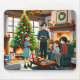 This is an original Habatour Creations festive mouse pad , decorated with an artistic illustration design, featuring a family around the fireplace at Christmas with a decorated Christmas tree