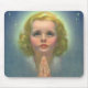 Illustration vintage religieuse chrétienne représentant le portrait d'une jeune fille blonde en prière. Elle ressemble à un bel ange avec un halo ou une aura et est entourée d'étoiles au ciel.