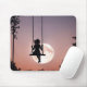 Silhouette fille sur une balançoire avec une pleine lune et des arbres dans le ciel rose