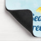 Mousepad avec le texte : Joyeuses Fêtes. Dessin fantaisiste d'un flamant rose portant un chapeau de santa rouge. Posé sur un monticule de sable de plage jaune avec à l'arrière un cocotier vert et marron. Arrière - plan bleu clair avec un motif polygonal faible. Design tropical sympa et festif.