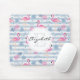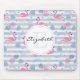 Un tapis de souris avec un motif avec une ambiance estivale amusante. Flamants roses et ananas posés sur un motif rayé bleu clair avec feuilles et coeurs tout autour.