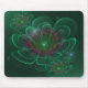 Composition éthérée de fleurs transparentes paraissant mystérieuses et aliens placées sur un arrière - plan océanique vert intense et paradisiaque décoré de nombreuses flammes qui brillent discrètement. L'image de l'art fractal suggère une visite dans un monde de réalité différent. Les fleurs sont transparentes et brillantes montrant une mystérieuse symétrie qui émerge des mathématiques des fractales. La séquence des formes est organiquement précise avec la corolle riche de plusieurs couches de pétales qui semblent se fermer du bord au centre. La palette de couleurs est originale et audacieuse, mêlant l'arrière - plan vert de l'océan et les pétales aux lignes violettes, émeraude et lumineuses.