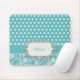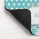 Une jolie conception dans le bleu de turquoise et le pois et les fleurs de blanc. Les motifs sont séparés avec une bande de turquoise avec une étiquette fleurie pour personnaliser avec le nom ou le monogramme.