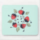 Mousepad aux fraises mignonnes avec une illustration vectorielle représentant 5 joyeuses fraises souriantes dansant en cercle entourées de feuilles et de fleurs de leur espèce. Design amusant avec un esprit de printemps pour une personne qui aime ces fruits délicieux.