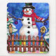 Un tableau d'aquarelle de Sandra Gale d'un neigeur traditionnel debout devant une clôture de piquetage avec des lumières de Noël brillantes reflétant la neige d'hiver. Oiseaux, maisons d'oiseaux et ornements de Noël en font une scène de Noël classique qui a l'air bien sur papier d'emballage, carte de fin de année et plus !