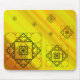 Trois styles de fractales dessinées à la main, y compris les triangles Siepinski, les joints apolloniens et un design carré à thème similaire, composent les couches de ce mandala géométrique, superposées sur un dégradé jaune et orange vif.