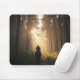 A cinematic mousepad featuring a lone rider on horseback traveling through a misty forest at sunrise. Warm golden light streams through tall pine trees, creating a peaceful yet adventurous atmosphere. Perfect for nature lovers and fantasy enthusiasts, this design brings depth, serenity, and epic storytelling energy to your workspace.