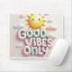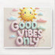 Lettres de bulles de couleur pastel : GOOD VIBES SEULEMENT. Au-dessus du texte, un soleil de dessin animé souriant, avec des étincelles et de minuscules nuages autour. Tons doux sur le blanc. Un design bondé de soleil pour soulever la pièce.