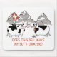 Les vaches humoristiques à bande dessinée dans un pâturage alpin posent cette question chargée avec les Alpes et le drapeau suisse à l'arrière-plan