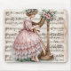 Une jeune femme dans une robe rose, parée de dentelle, joue d'une harpe entourée de partitions
