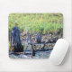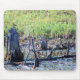 Une photo d'un Grand Héron Bleu marchant à travers un étang, par des troncs et des branches d'arbres tombés. Les souches d'arbres sont encore là où les arbres ont jadis atteint des hauteurs vertigineuses il y a longtemps. Les arbres servent de poteaux de perchage pour les oiseaux. La surface de l'étang est recouverte de nénuphars. L'étang est entouré de tiges de plantes verts, qui bordent un pré. Copyright photo ©2021 Kimberly J Tilley.